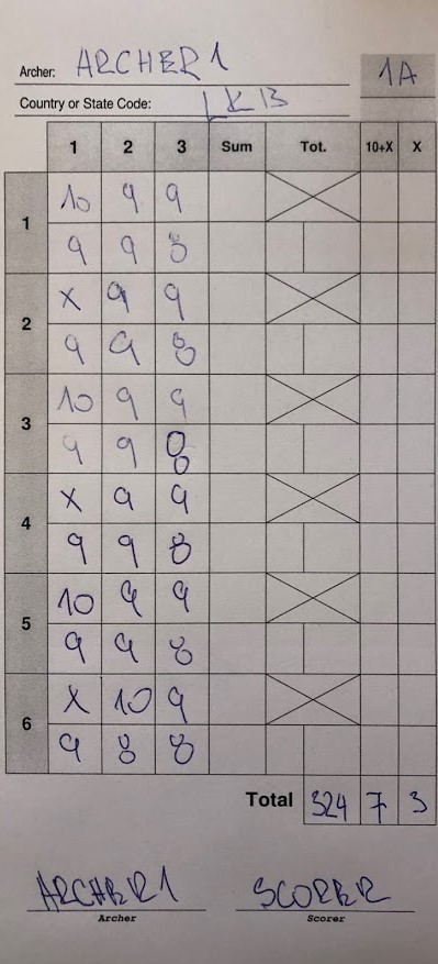 The organisers are not required to accept or record scorecards that have not been signed, and/or do not contain the sum total, and/or the number of 10's and/or the number of X's (or 9s for indoor) and/or which contain mathematical errors.